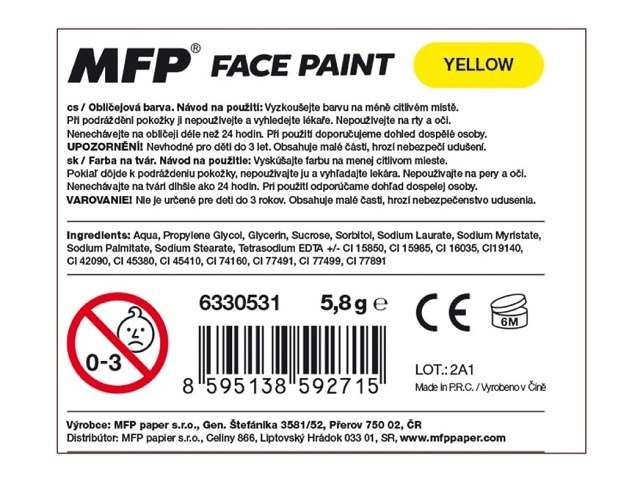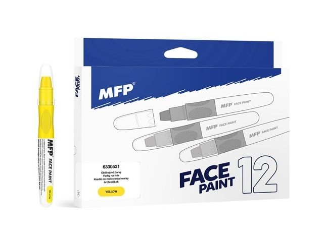 Barva na obličej žlutá, na principu rtěnky (6g) - Díky těmto pestrým barvám vykouzlíte na tváři dítěte krásnou masku na karneval, párty nebo jinou oslavu. Dermatologicky testováno. NÁVOD NA POUŽITÍ: 1. Doporučujeme vyzkoušet barvičky na méně citlivém místě. 2. Dojde-li k podráždění pokožky, nepoužívejte a vyhledejte lékaře. 3. Nepoužívejte na rty a oči. 4. Barvičkami malujeme na suchou pokožku. 5. Jednoduše omyvatelné vodou a mýdlem, barvy zdravotně nezávadné. 6. Nedoporučujeme nechávat na obličeji déle než 24 hodin. 7. Při použití doporučujeme dohled dospělé osoby. VAROVÁNÍ: Nevhodné pro děti do 3 let, nebezpečí spolknutí malých částí. Uvedená cena je za 1 ks. Všech 12 ks je baleno v papírové krabičce.