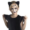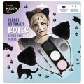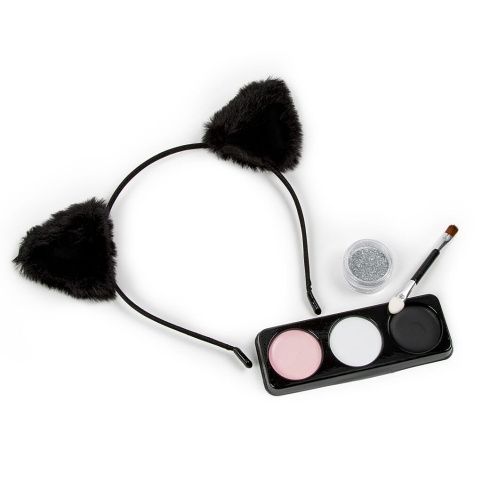Součásti sady na obličej jsou tři barvy, stříbrný brokát, oboustranný nanášecí štěteček a čelenka s ušima.