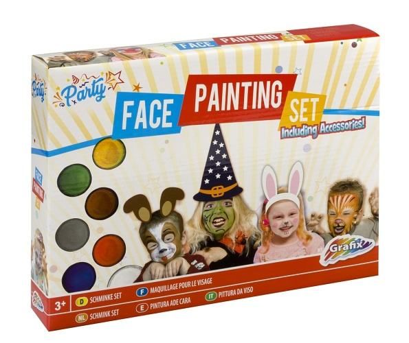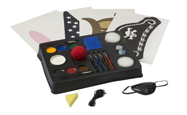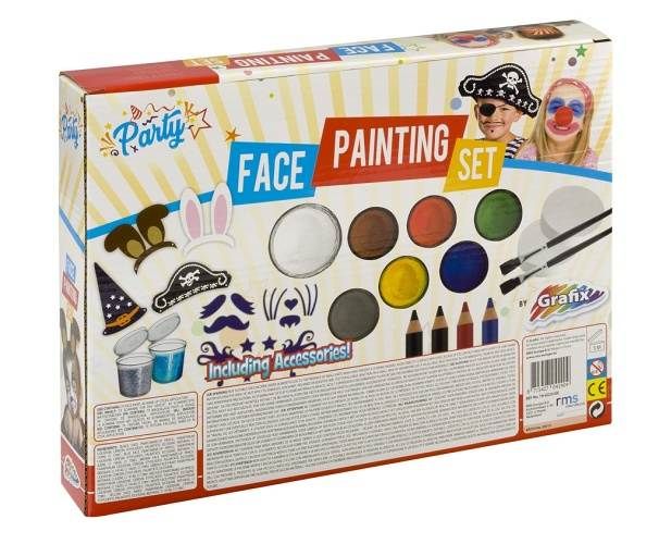 Sada barvy na obličej s příslušentví obshuje – 7 různých baredv na obličej, 2 štětce, 4 tužky na obličej, dva kelímky s třpytkami, šaškovský nos, houbičky na aplikaci, vystřihovací čepice, pirátskou pátsku přes oko a další. Splňuje normy EU, zdravotně nezávadné.