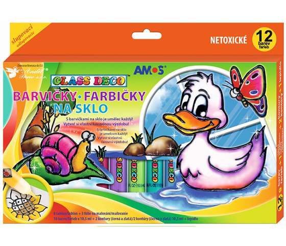 Sada slupovacích barev na sklo. Vytvořený obrázek můžete po zaschnutí přenést a umístit na okno, zrcadlo, sklenici, dlaždici nebo jiné hladké podklady. Barvy zanechávají skvrny na oblečení.12 barevSada obsahuje 10 různých barviček, 2 konturovací barvy (černá, zlatá), šablonky s 8 vzory, 3 fólie, 1 lepidlo k uchycení fólií k předlohám a 1 ilustrovaný prospektObsah: 10,5 ml