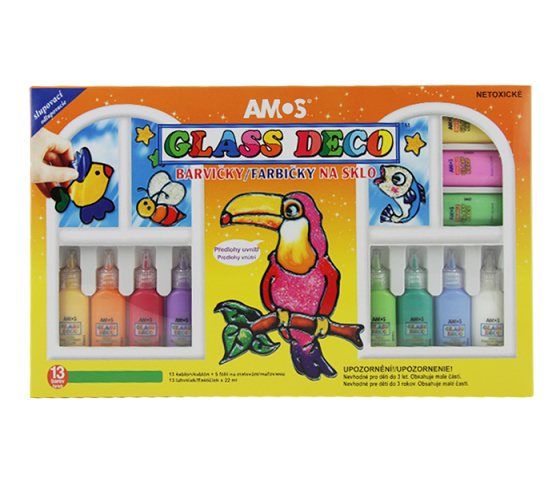 Sada slupovacích barev na sklo. Vytvořený obrázek můžete po zaschnutí přenést a umístit na okno, zrcadlo, sklenici, dlaždici nebo jiné hladké podklady. Barvy zanechávají skvrny na oblečení.Balení: 13ks barevSada obsahuje: 11 odstínů barviček včetně třpytivých, 2 černé konturovací barvy, šablonky se 13 vzory a 5 fóliíObsah: 22ml