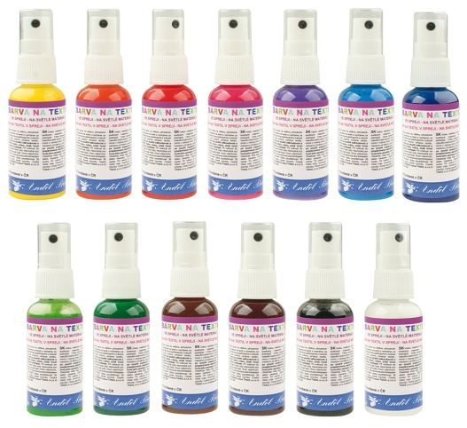 BARVA NA TEXTIL NA SVĚTLÉ MATERIÁLY VE SPREJI 50g Vodou ředitelná barva na většinu přírodních materiálů. Barvu naneseme na textil a necháme zaschnout. Potom ji několik minut zažehlujeme z rubové strany. Pereme podle pokynů výrobce textilu. Obsah lahvičky: 50 ml. Vyrobeno v ČR