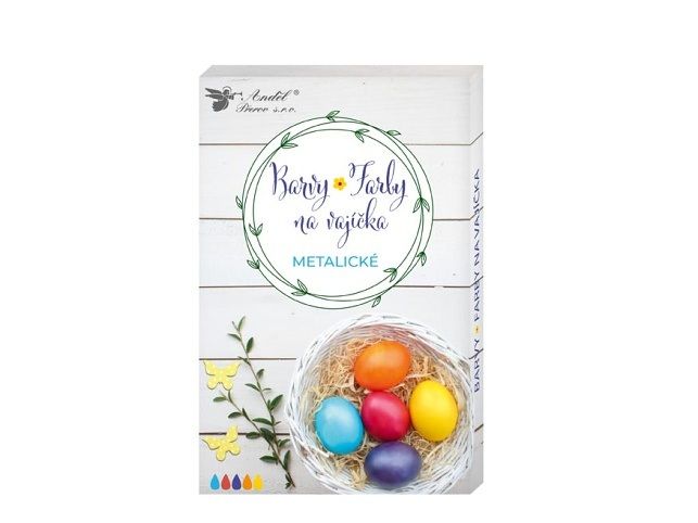 Sada gelových metalických barev na vajíčka. Součástí balení jsou rukavice. OBSAH BALENÍ: - 5 ks gelových barev (červená, modrá, žlutá, oranžová, fialová) - rukavice NÁVOD: 1. Vejce uvařte v osolené vodě. 2. Barvy pomocí nůžek oddělte. Lahvičky s barvivem vložte do sklenice s teplou vodou dokud nebudou mírně tekuté a následně důkladně protřepejte. 3. U požadované barvy odstřihněte špičku a dejte zpátky do sklenice s teplou vodou. 4. Nasaďte si rukavice. 5. Kápněte do dlaní 6-7 kapek požadované barvy. Vložte teplé vejce do dlaně a přendávejte si jej z jedné dlaně do druhé, dokud nebude obarveno dle vašich představ. 6. Před barvením dalšího vejce přidejte 3 kapky barvy do dlaně. Jedna tuba nabarví 4 - 5 vajíček. Uvedená cena je za 1 balení.