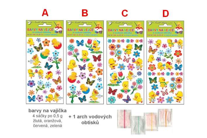 Balení obahuje 4 ks po 5 g práškové barvy (žlutá, oranžová, červená, zelená) a velikonoční vodové obtisky.