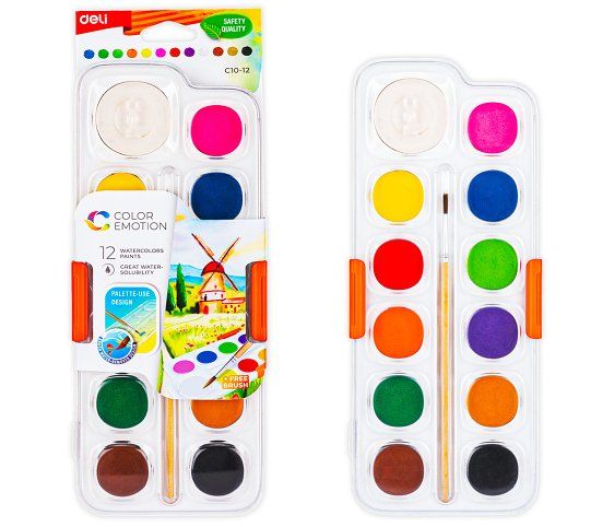 Barvy vodové se štětcem 12 barev 28mm, DELI (EC10-12)