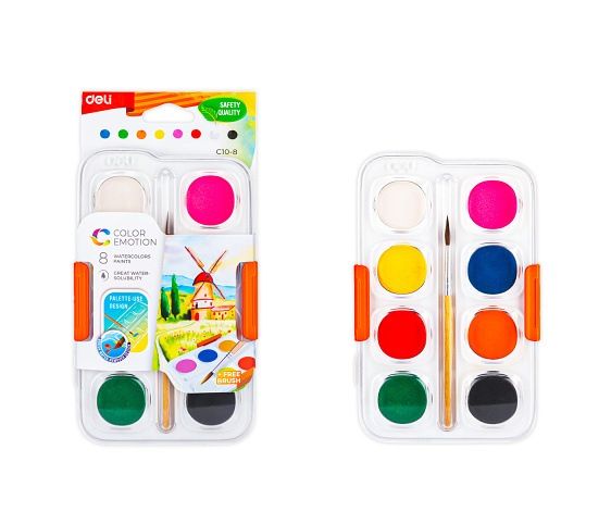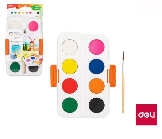 Barvy vodové se štětcem 8 barev 28mm, DELI (EC10-8)