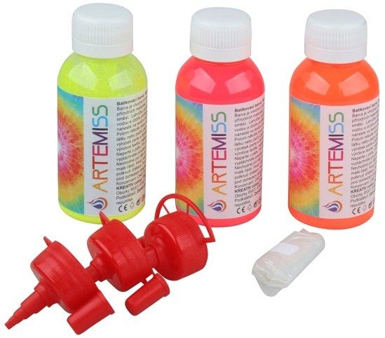 Sada k batikování - NEONOVÉ BARVY - LETNÍ Barva je vhodná k barvení většiny přírodních materiálů, polyesteru a směsí.Hotový výrobek můžete prát i žehlit dle pokynů výrobce textilu.Barvy je možné mezi sebou míchat a vzniknou tím nové odstíny.Navíc pod UV lampu svítí.Sada obsahuje: 3 barvy po 33 gramech v aplikační nádobce:neon žlutáneon oranžováneon červenárukaviceNávod: Lahvičku s barvou doplňte studenou vodou a dobře protřepejte.Textil namočte do vody a pořádně vyždímejte.Barvu následně naneste na složený textil a nechte zaschnout.Poté několik minut zažehlujte přes látku nebo pečící papír.Vyrobeno v České republice.