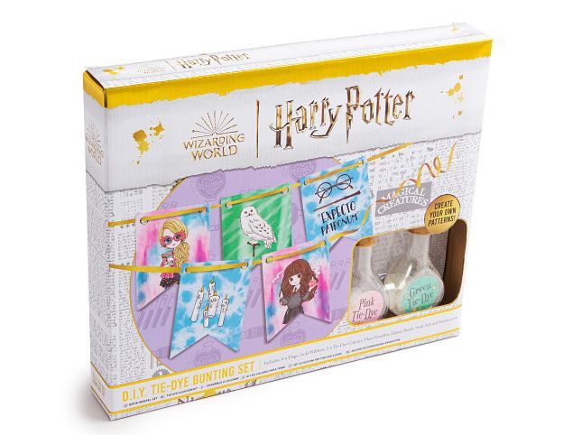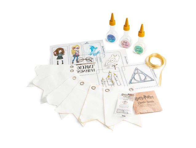 Batikovací sada – vlaječky Harry Potter. Kreativní sada na výrobu batikovaných vlaječek s motivem Harry Potter. Balení obsahuje – 6 vlaječek, zlatou stuhu, 3× batikovací barvy, gumičky, sodu a návod.