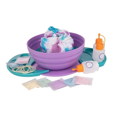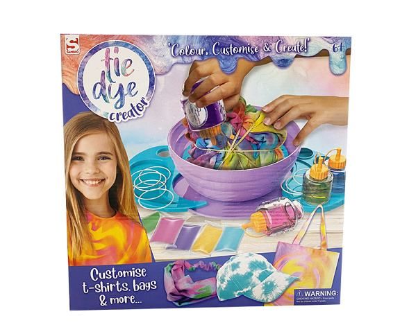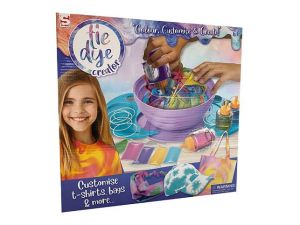 Obarvi si ponožky, tričko, kalhoty, tašku… Sada obsahuje nádobu na batikování, nádobky na barvy, rukavice, gumičky na smotání oblečení, rukavice, barvy v sáčku a tipy na různé styly batikování. Možno dokoupit další lahvičky s barvami. Položka číslo M5200059.