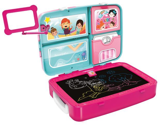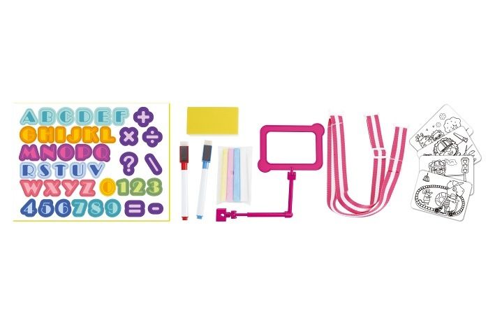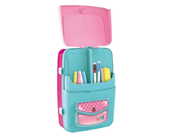 Batoh kreativní. Velikost 28cm. Otevírací batoh, obsahuje otevíratelné přihrádky, kreslicí tabulku na mazací fixy a přichycení magnetek, druhou strana tabulky lze popsat křídou, magnetická čísla a písmenka, křídy, hubku na mazání, mazací fixy, popruhy na záda, nálepky na ozdobení batohu.