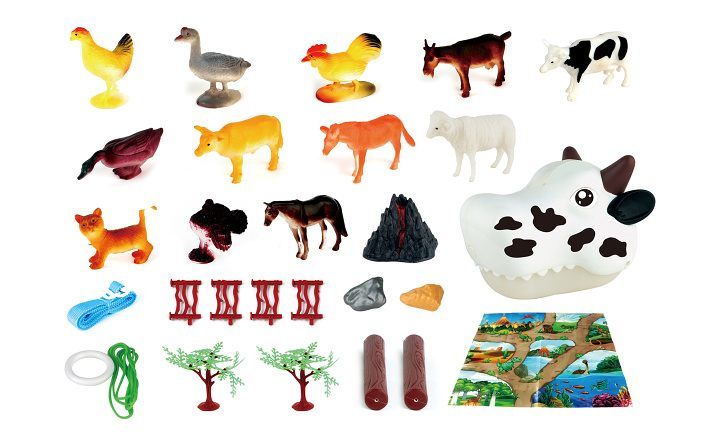 Batoh se zvířátky farma. Rozměry 27x17x19 cm. Součástí zvířátka, stromy a další, hrací mapa, popruh na záda, šňůra s popruhy (lze batoh táhnout), rukojeť v horní části batohu. Návod na instalaci popruhů a šnůry na spodní částí obalu.