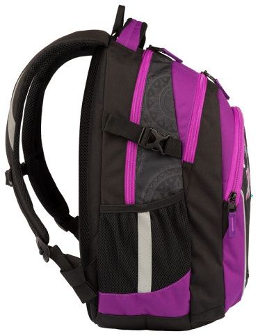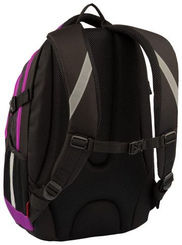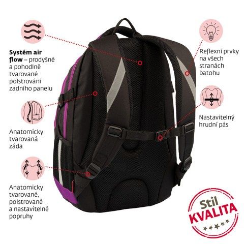 Školní batoh VHODNÝ OD 5. TŘÍDY. Kvalitní, ergonomicky tvarovaný odlehčený Školní batoh s 3D zádovým systémem. Parametry školního batohu: Rozměr: v 46 cm x š 34 cm x h 20 cm. Hmotnost 0,8 kg. Objem: 25 l. Nosnost: 8 kg. Vlastnosti školního batohu: Polstrování je z prodyšného materiálu. Na bocích batohu jsou kapsy na láhev na pití. Skládá se ze 3 komor, hlavní a prostřední komora je vhodná pro formát A4, v přední kapse je organizér na drobné předměty, klíče apod. Kapsa na notebook (do velikosti 15") v zadní komoře. Postranní stahovací přezky na ztenčení prázdného batohu. Bezpečnostní prvky na všech stranách batohu. Polstrované ramenní popruhy. Hrudní pás pro lepší rozložení váhy batohu na zádech. Zpevněné dno. Vodoodpudivý materiál - 100% polyester.