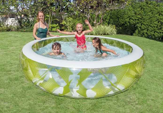 Rozměry: 229 x 56 cm, Objem: 670 l (při výšce hladiny 29 cm), široké stabilní stěny, vyroben z pevného a odolného vinylu, integrovaný vypouštěcí ventil, nafukovací dno