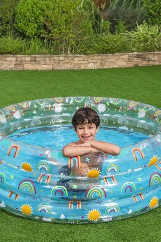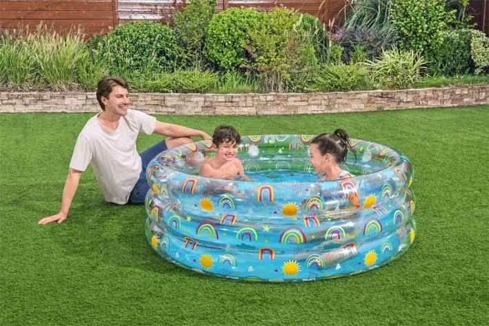 Krásný nafukovací tří kruhový bazén s veselými obrázky duhy sluníčka a hvězdiček, ve kterém užijete v horkých letních dnech spoustu zábavy a příjemného osvěžení.