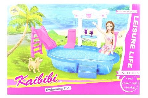 Bazén pro panenku obsahuje bazének, skluzavku, 2 lehátka, bar, pejska a další doplňky. Panenka není součástí balení. Rozměry balení cca 35 x 24,5 x 7,5 cm. Věk 3+