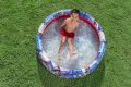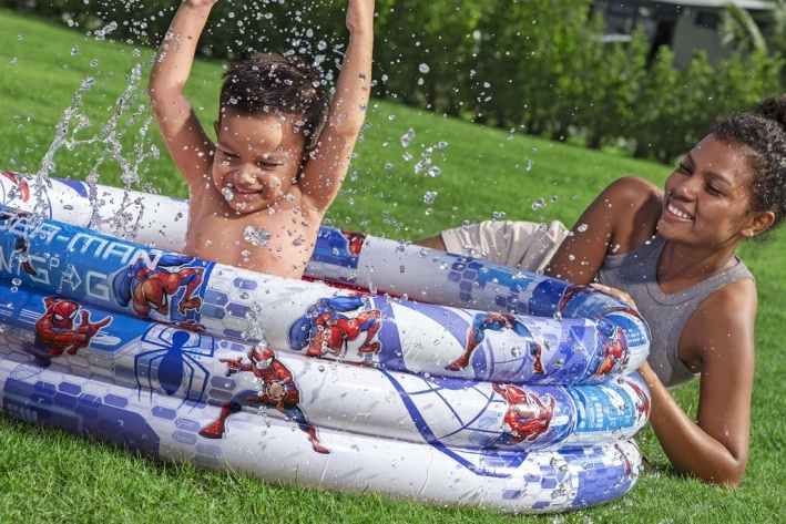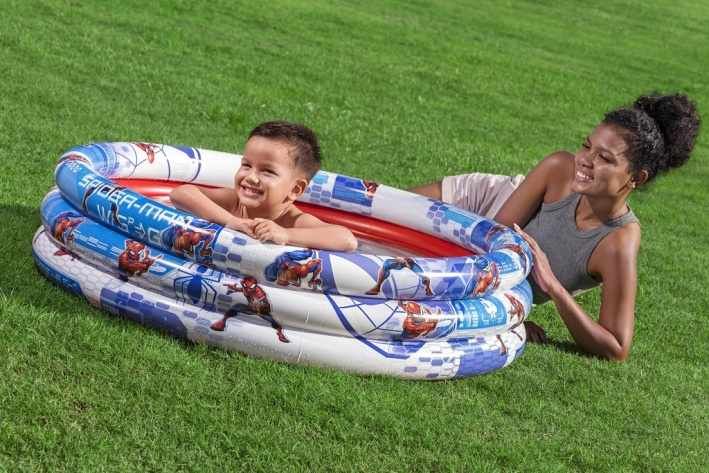 Bazén tříkruhový Spider-Man o rozměrech 1,22 metru v průměru a výšce 30 cm je navržený především pro děti od dvou let. Tento nafukovací bazén nabízí dostatečný prostor pro malé superhrdiny, kteří si chtějí užít letní osvěžení na zahradě nebo na jiném venkovním prostoru. Vizuálně bazén zaujme výrazným barevným designem s motivy Spider-Mana, který je vyveden v kombinaci modré, bílé a červené barvy. Tři nafukovací kruhy tvoří pevnou konstrukci, která zajišťuje stabilitu během hraní v bazénu. Materiál, ze kterého je bazén vyroben, je kvalitní vinyl, který je odolný vůči poškození a snadno se udržuje. Tento materiál je zároveň příjemný na dotek a bezpečný pro děti. Vnitřní část bazénu je červená, což kontrastuje s modrobílým vzorem na stěnách a vytváří tak atraktivní a hravý vzhled. Objem vody, který bazén pojme, je cca 200 litrů, což je dostatečné množství pro pohodlnou zábavu dětí. Součástí balení je také opravná sada, která umožňuje snadné a rychlé opravy případných drobných defektů, čímž se prodlužuje životnost bazénu. Díky své konstrukci a rozměrům je bazén snadno přenosný a rychle nafouknutelný, což ocení rodiče i děti. Bazén je vhodný nejen na koupání, ale i na hraní s vodou, což dokládají fotografie dětí, které si v bazénu užívají vodní radovánky pod dohledem dospělých. Celkově jde o praktický a vizuálně atraktivní produkt, který spojuje oblíbený dětský motiv s kvalitním materiálem a funkčností. Tento Spider-Man bazén je ideální volbou pro letní dny plné zábavy a osvěžení pro nejmenší děti.