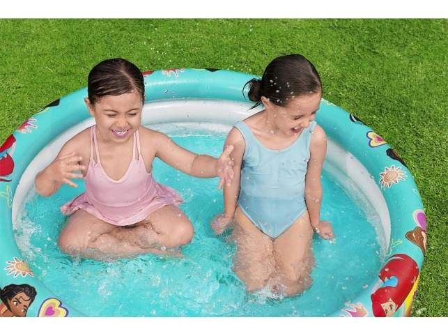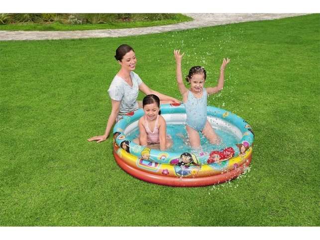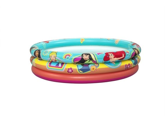 Bazének Disney Princess tříkomorový ?122 cm. Nafukovací dětský bazének s krásným designem princezen je ideální volbou na zahradu během horkých letních dní, kdy se děti chtějí ochladit a zadovádět si ve vodě. Bazének je vyrobený z pevného vinylu. Konstrukci tvoří tři stejně velké prstence, každý se nafukuje zvlášť pomocí pojistných ventilů. Objem vody: 200 l. Rozměr: 122 × 30 cm. Opravná sada součástí. Doporučený věk: 2+
