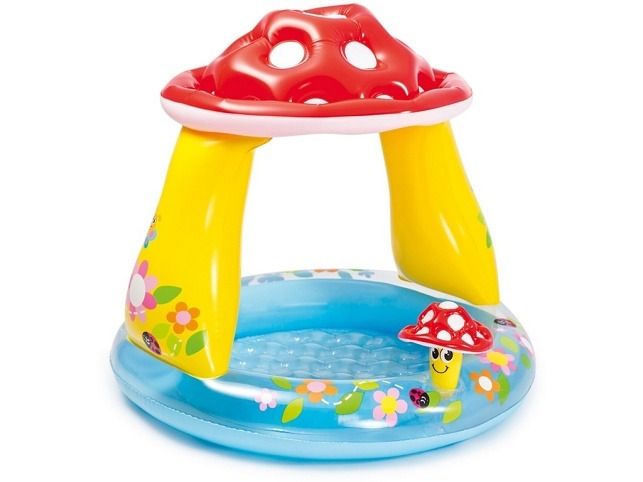 INTEX 57114 BABY POOL nafukovací bazén pro děti o rozměru 1,02 m x 89 cm s ochranou stříškou ve tvaru muchomůrky. Dopřejte osvěžení v parných letních dnech i těm nejmenším. Stříška pomůže ochránit dítě před přímými slunečními paprsky. Výhodou bazénu je jednoduchá instalace. Stačí rozložit bazén na hladkou vodorovnou a dostatečně stabilní plochu, nafouknout a napustit vodu. Stěny bazénu jsou vyrobeny ze zdravotně nezávadného vinylu o tloušťce 0,25 mm. Objem vody při výšce hladiny 13 cm je 45 l. Výrobky značky Intex splňují nejpřísnější bezpečnostní normy na zpracování a použité materiály. Balení obsahuje opravnou sadu. Parametry:Nafukovací bazén se stříškouRozměry: 1,02 m x 89 cmObjem vody při výšce hladiny 13 cm: 45 l Opravná sadaVhodné pro děti od 1 do 3 let