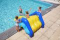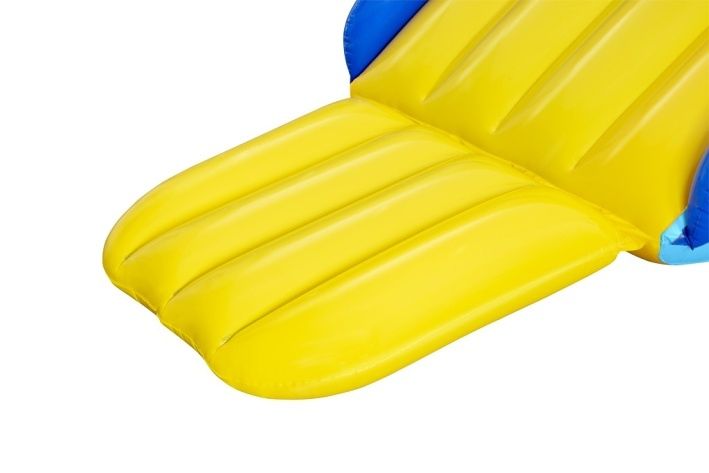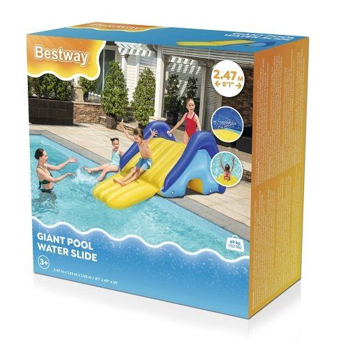 Jednoduše jej položte na okraj vašeho bazénu a připojte vodní hadici, abyste aktivovali vestavěné postřikovače a naplnili 4 vodní komory, aby byla skluzavka stabilní. Nosnost 69 kg. Rozměry skluzavky jsou 247 × 124 × 100 cm a součástí balení je opravná záplata.