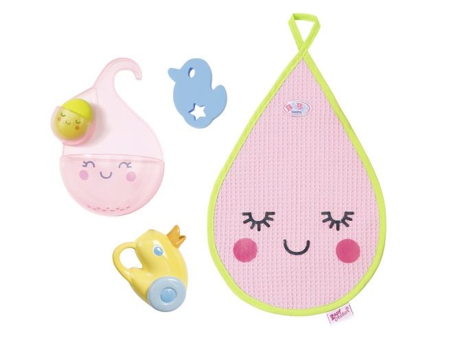 Cáky-cák, koupání je taková legrace. Zejména se sadou koupelnových doplňků pro BABY born. Součástí je konvička ve tvaru kačenky Berty, houbička ve tvaru kačenky, limetkově zelené mýdlo, ručník ve tvaru kapky a držák na mýdlo/malá nádržka na vodu s velkou nádržkou na vodu. Zkus si vytvořit vlastní vodopád! Nejprve naplň vodou konvičku, pak vodu přelej do horního zásobníku, pak ji postupně přelej do spodního zásobníku, a nakonec do vany. A po hraní vše pěkně usuš ručníkem ve tvaru kapičky. Originální doplněk pro panenky BABY born. Pečlivě navržené doplňky rozvíjejí dětskou představivost a otevírají nové možnosti a témata hry. BABY born Doplňky do koupelny se zásobníky na vodu, konvičkou, houbičkou, mýdlem a ručníkem.