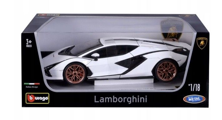 Bburago BB11046BK Lamborghini Sián FKP 37 v bílo-černé barvě je kovový model auta, který ocení nejen sběratelé. Má otevírací dveře a kapotu, řízení kol je plně funkční.