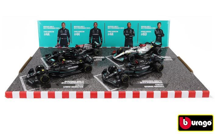 Bburago 1:43 RACE Formula F1 4PAC Mercedes-AMG F1 W15 (2024) #44 L. Hamil ton #63 G. Russel