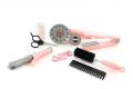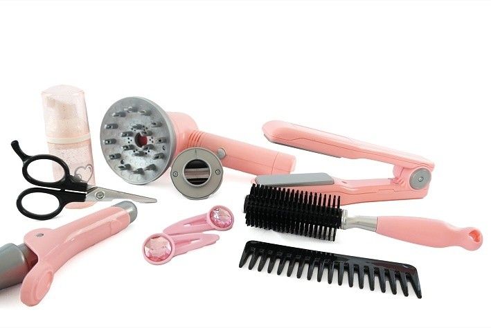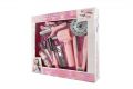 Sada pro kadeřnice v trendové šedo-růžové barvě obsahuje kulmu, fén na baterie s difuzérem, nůžky, hřebínek, kartáč, žehličku na vlasy, sponky, sprej na vlasy.