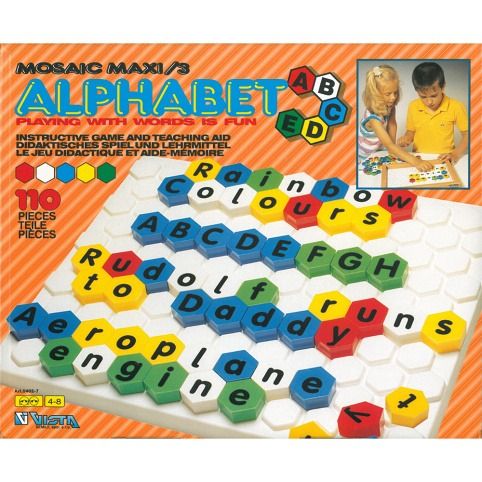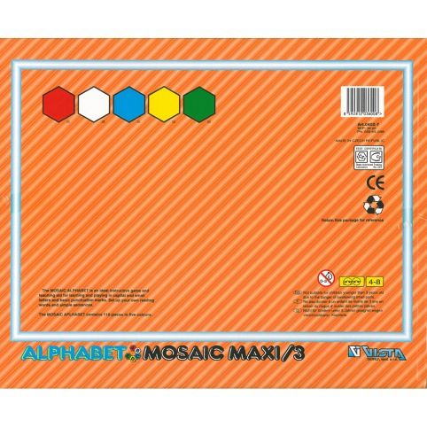 Stavebnice Alphabet - Mosaic Maxi /3 obsahuje 110 dílků v 5 barvách (žlutá, červená, zelená, modrá a bílá) a je určená nejmladším pro seznámením se s anglickou abecedou a skládání slov. Určeno pro děti od 4 let.