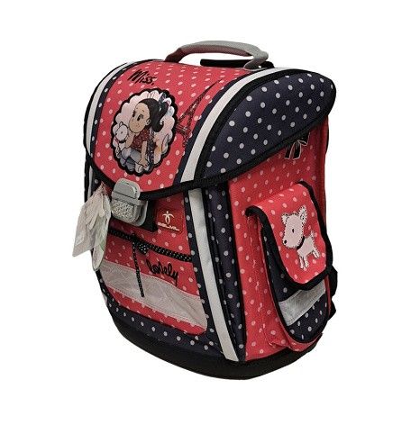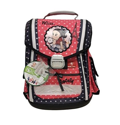 Lehký školní batoh (1000g) Miss Lovely Girl s mnoha funkčními prvky. Vyroben z vysoce kvalitního, pevného a nepromokavého materiálu. Zesílená konstrukce a pevné dno pro lepší stabilitu. Ergonomicky tvarovaná polstrovaná záda a ramenní popruhy. Gumová rukojeť, poutko pro zavěšení. Spolehlivý a snadno použitelný kovový zámek. Reflexní prvky na všech stranách pro větší bezpečnost a viditelnost.