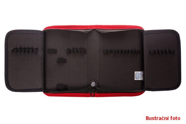 Nevybavený penál, jednoduchý s jednou chlopní, uvnitř vybaven gumovými úchyty na psací potřeby, kapsičkou na suchý zip vhodnou na maličkosti a přepážkou s průhlednou folií a rozvrhem hodin.