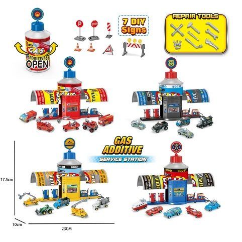 Benzínová pumpa pro auta se spoustou doplňků a reálných detailů.