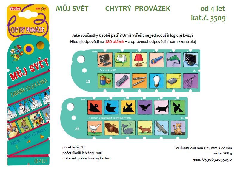 Jaké součástky k sobě patří? Umíš vyřešit nejjednodušší logické kvízy? Hledej odpovědi na 180 otázek – a správnost odpovědi si sám zkontroluj. Ideální výuková hra, při níž se dítě učí systematicky přiřazovat, srovnávat, počítat a hledat rozdíly, shody nebo chyby. Pomocí provázku spojuje logické dvojice a na rubové straně mu provázek ukáže, zda jsou odpovědi správné. Pomůcka vede dítě k samostatnosti a sebereflexi. Doporučeno odbornými pedagogy.