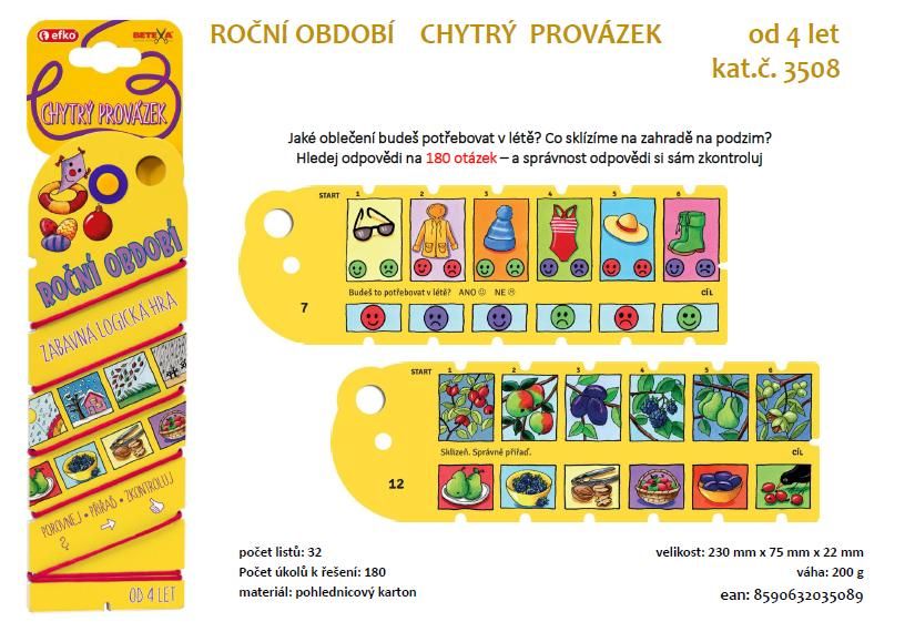 Jaké oblečení budeš potřebovat v létě? Co sklízíme na zahradě na podzim? Hledej odpovědi na 180 otázek – a správnost odpovědi si sám zkontroluj. Ideální výuková hra, při níž se dítě učí systematicky přiřazovat, srovnávat, počítat a hledat rozdíly, shody nebo chyby. Pomocí provázku spojuje logické dvojice a na rubové straně mu provázek ukáže, zda jsou odpovědi správné. Pomůcka vede dítě k samostatnosti a sebereflexi. Doporučeno odbornými pedagogy.