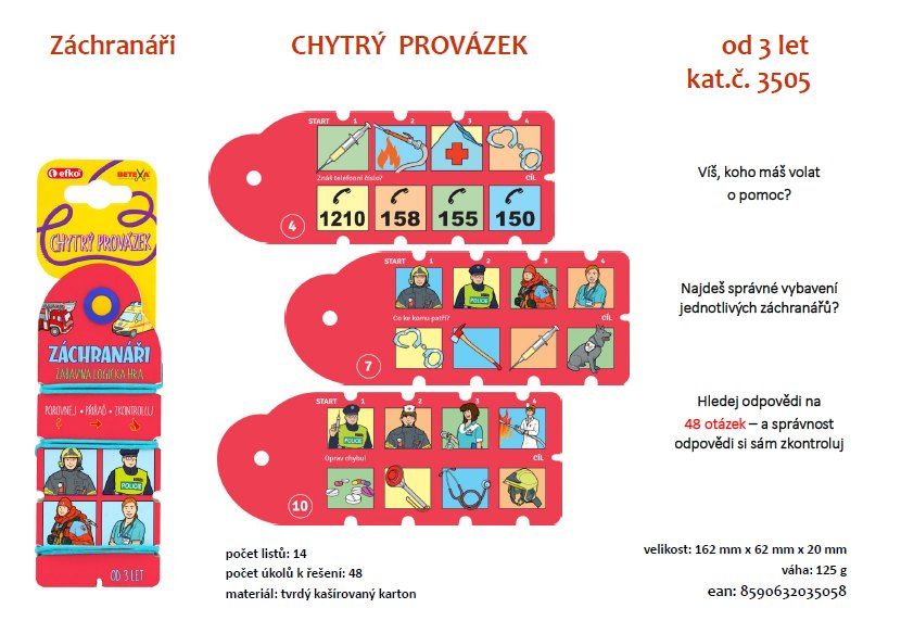 Víš, koho máš volat o pomoc? Najdeš správné vybavení jednotlivých záchranářů? Hledej odpovědi na 48 otázek – a správnost odpovědi si sám zkontroluj. Ideální výuková hra, při níž se dítě učí systematicky přiřazovat, srovnávat, počítat a hledat rozdíly, shody nebo chyby. Pomocí provázku spojuje logické dvojice a na rubové straně mu provázek ukáže, zda jsou odpovědi správné. Pomůcka vede dítě k samostatnosti a sebereflexi. Doporučeno odbornými pedagogy.