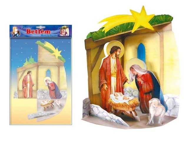 Skládací betlém barevný s glitrem - Poskládejte si papírový betlém s Josefem, Marií a malým Ježíškem v jesličkách. Sestavení je velice jednoduché a nepotřebujete k němu žádné nástroje. Betlém má glitry a lze ho velice lehce rozložit a zase uschovat. Uvedená cena je za 1 ks.