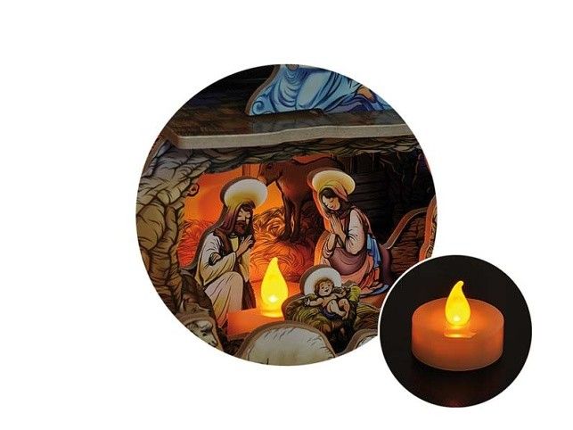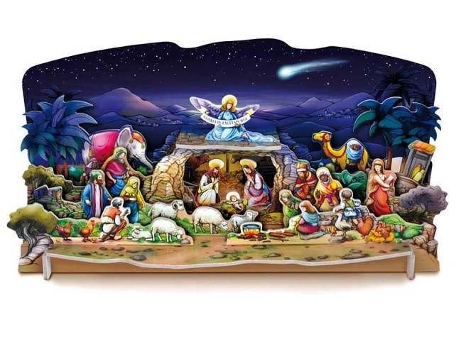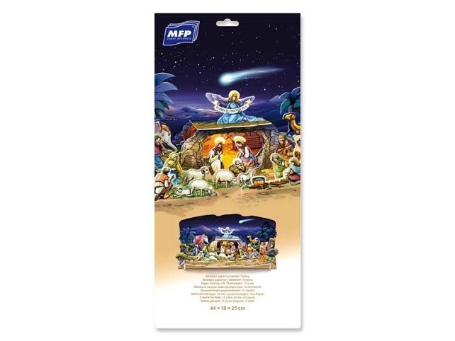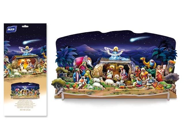 Vysekávaný, jednoduše sestavitelný betlém bez lepidla a nůžek. Vyrobený z 3 mm silné lepenky potažené laminem, rozměr sestaveného betlému 44 x 21 x 18cm.