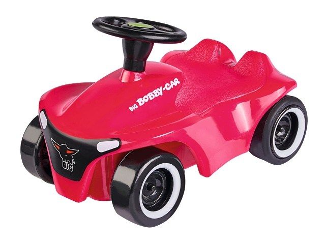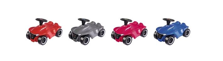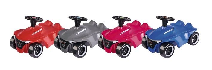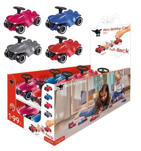 Miniaturní model BIG-Bobby-Car Neo ve 4 různých barvách (červená, modrá, růžová, šedá), na zpětný chod. Displej 12 kusů.
