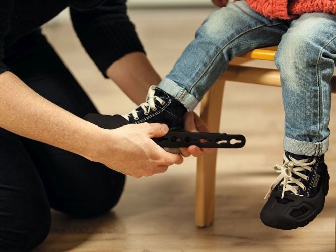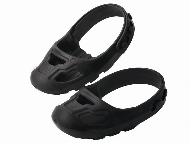 Ochranné návleky na botičky v černé barvě pro jízdu např. na odrážedle, cyklokole apod. Nezanechávají stopy na podlaze, protiskluzová úprava. Snadno nastavitelná velikost pomocí háčků a oček. Vhodné pro dětskou obuv velikosti 21-27.