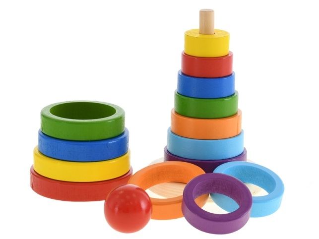 Barevná dřevěná pyramida pro nejmenší děti, která rozvíjí dětskou motoriku a učí rozpoznávat barvy. Dřevěné kroužky a kolečka se skládají podle velikosti na/do sebe na základnu se stojánkem. Balení obsahuje celkem 16 dílků. Vhodné pro děti od 18 měsíců.