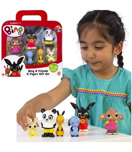 Sada 6 postav z populární pohádky králíček Bing. Sada obsahuje všechny oblíbené postavičky ze seriálu: Bing, Flop, Sula, Amma, Pando a Charlie. Díky těmto figurkám z vysoce kvalitního plastu si vaše dítě bude moci zahrát své oblíbené pohádkové scény. Vhodné pro děti od 18 měsíců.