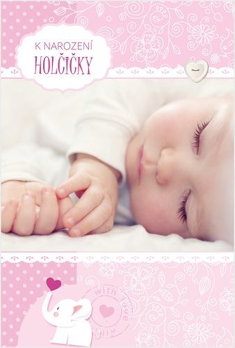 Přání o rozměru 170x110mm je zdobeno růžovou ražbou a je dodáváno v sáčku s obálkou. Vnitřní text: "Gratulujeme k narození Vaší holčičky. Přejeme jí do života hlavně zdraví, smích a lásku."