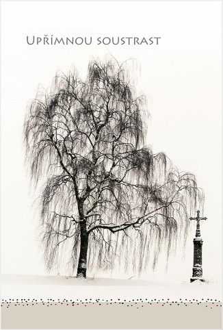Vnitřní text: "Dny plynou jak tiché řeky proud, jen bolest v srdci trvá a nedá zapomenout. "Přání o rozměru 115 x 170 mm je tištěno na strukturovaném papíře. Je dodáváno v sáčku s obálkou.