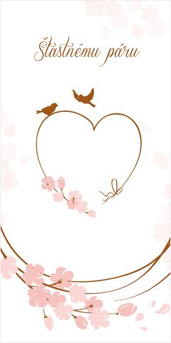 Vnitřní text: "Ať je Vaše manželství stejně krásné a šťastné jako láska, která Vás k němu přivedla! Blahopřejeme". Přání o rozměru 100 x 200 mm je tištěno na strukturovaném papíře a zdobeno hnědou ražbou. Dodávame v sáčku s obálkou.