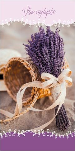 Přání o rozměru 100 x 200 mm je zdobeno fialovou ražbou a je dodávano v sáčku s obálkou. Vnitřní text: "Hodně lásky, zdraví a radostných dnů přeje"