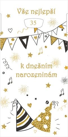 Blahopřání k výročí s otočným číselníkem 10 - 109. Je zdobeno zlatou ražbou a je dodáváno v sáčku s obálkou. Rozměr přání: 100 x 200 mm. Vnitřní text: "Hodně štěstí, zdraví a spokojenosti přeje"