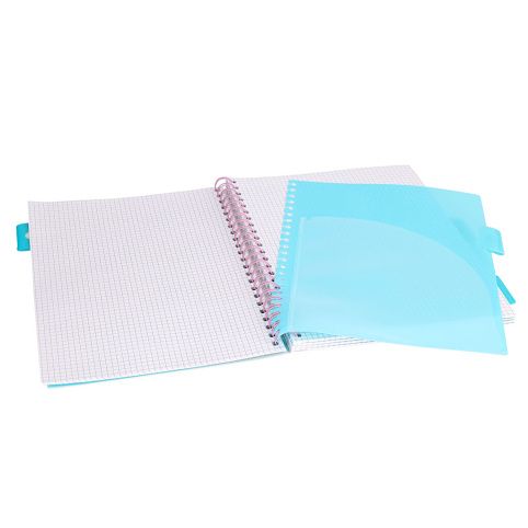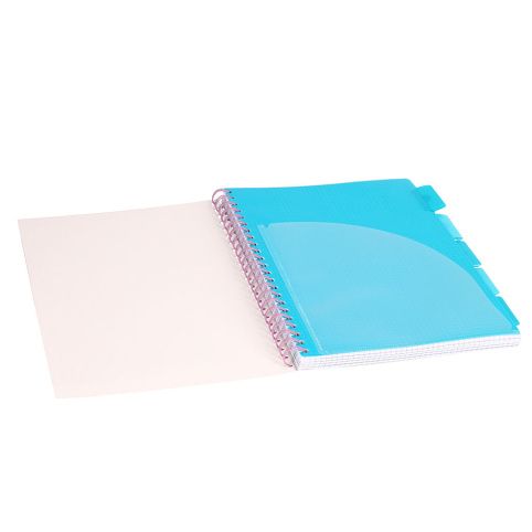 Poznámkový blok s boční spirálou, A4 100 listů, čtverečkovaný. Barevné rozlišovače pro lepší orientaci. Perforované stránky.