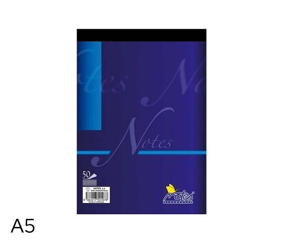 Poznámkový trhací blok- z bezdřevého papíru- šitý na kratší straně- podlepený šedou lepenkou- formát: A5- počet listů: 50- vzor: čistý- gramáž: 60g/m2