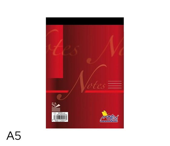 Poznámkový trhací blok- z bezdřevého papíru- šitý na kratší straně- podlepený šedou lepenkou- formát: A5- počet listů: 50- vzor: linkovaný 8mm- gramáž: 60g/m2