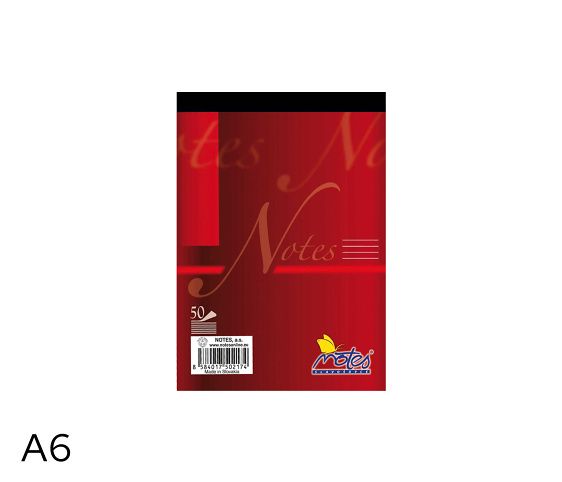 Poznámkový trhací blok- z bezdřevého papíru- šitý na kratší straně- podlepený šedou lepenkou- formát: A6- počet listů: 50- vzor: linkovaný 8mm- gramáž: 60g/m2