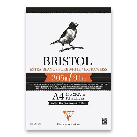 Blok Clairefontaine Bristol 205 g má extra bílý a velmi hladký papír. Papír je vyroben ze 100% celulózy. Je vhodný pro technické kreslení tužkou, technickým perem nebo inkoustem. Obsahuje 20 listů s gramáží 205 g.